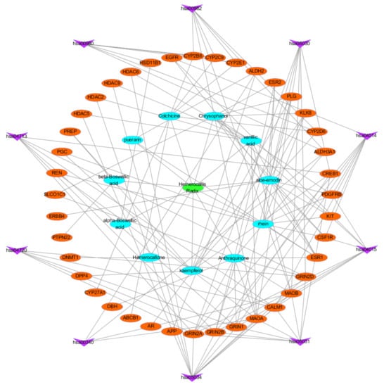 Component-target-pathway network of HR and DD. The green ellipse is the target herb— Hemerocallis Radix, the blue ellipse are bioactive components, the orange ellipse indicates the related targets, and the purple arrow nodes represent pathways.