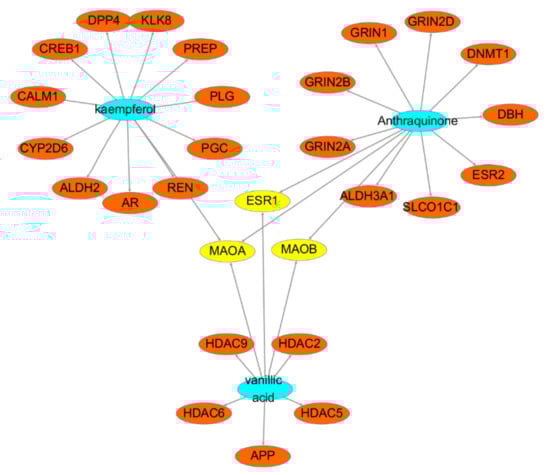 Furthermore, the top3 key components and their related genes are presented in Figure 14. The main bioactive components are anthraquinone, kaempferol, and vanillic acid. Anthraquinone is an aromatic organic compound with formula C14H8O2. Previous studies showed that anthraquinone has only moderate inhibition effect or is even inactive against mouse Monoamine Oxidase (MAO) enzyme [,]. However, a recent study indicated that anthraquinone showed moderate to potent inhibition of human MAO enzyme activity. Though human MAO and mouse MAO have 92% sequence identity, differential sensitivity to phentermine inhibition suggests that structural and functional differences exist between them. That is to say, the type of MAO enzyme must be the reason for these inconsistent findings []. Consistent with our study, anthraquinone can down-regulate MAOA and MAOB, and all the gene data we used were set at Homo sapiens. Kaempferol is a natural flavonol—a type of flavonoid—found in a variety of plants and plant-derived foods. It has been proved to be a potent MAOA and MAOB inhibitor, antioxidant, and presents neuroprotective effect in the mouse model [,]. In spite of that, a more recent study showed that kaempferol acts as a selective inhibitor of human MAOA which is consistent with our study []. Vanillic acid is a phenolic acid with formula C8H8O4, found in some forms of vanilla and many other plant extracts. It is reported to possess strong antioxidant, anti-inflammatory, antinociceptive, and neuroprotective effects [,,,]. It has also been proved that vanillic acid has hepatoprotective effect, and is often used in the treatment of depression in TCM, and can suppress hepatic fibrosis in chronic liver injury []. Interestingly, although multiple phenolic acids have anti-depression effect, there is no scientific data that prove that vanillic acid alleviates depression, only several findings on the reduced concentrations of homo-vanillic acid (HVA) in cerebrospinal fluid [,,] and mild inhibition of human MAOA and MAOB from virgin olive oil-extracted vanillic acid [].