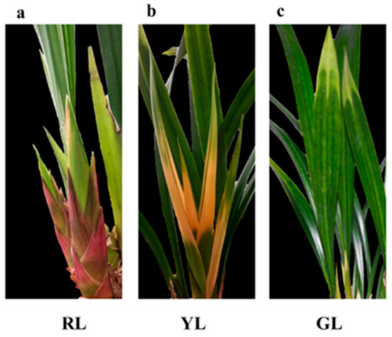 Phenotypes of Cymbidium sinense ‘Red Sun’ red leaves (RL) (a), yellow leaves (YL) (b) and green leaves (GL) (c).