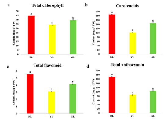 Chlorophyll (a), carotenoids content (b), total flavonoid (c) and total anthocyanin (d) content of different color leaves of Cymbidium sinense ‘Red Sun’. Bars represent the mean of three biological replicates ±SE. Lowercase letters indicate significant differences at p < 0.05.