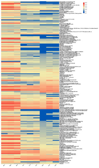 Hierarchical clustering analysis of all metabolites detected in this study. The abscissa indicates three biological replicates of red leaves (RL1, RL2, and RL3), yellow leaves (YL1, YL2, and YL3) and green leaves (GL1, GL2, and GL3), and the ordinate indicates the metabolites detected in this study. The red segments indicate a relatively high content of metabolites, while the blue segments indicate a relatively low content of metabolites. The relative metabolite contents represented by color segments at the corresponding locations are listed in Table S1.