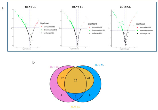 (a) Volcano plot of differential metabolites for RL vs. GL, RL vs. YL and YL vs. GL. The colors of the scatter points in Figure 4a indicate the final screening results: red indicates metabolites that were significantly up-regulated; green indicates metabolites that were significantly down-regulated; grey indicates metabolites with no significant difference. (b) Venn diagram analysis of differential metabolites. RL, red leaves; YL, yellow leaves; GL, green leaves.