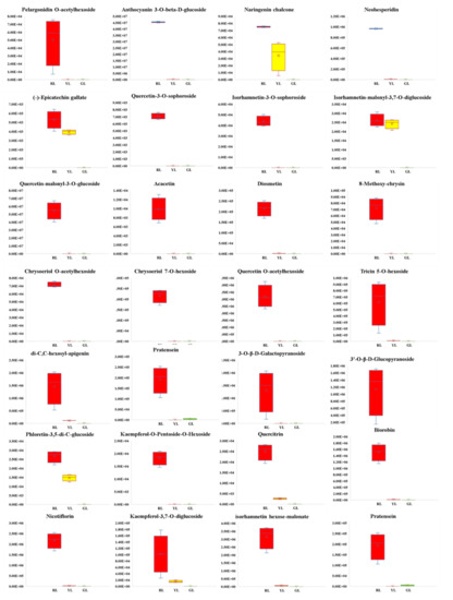 As far as we know, this is the first time to analyze the types of flavonoid-related metabolites in the leaves of C. sinense ‘Red Sun’ by UPLC-MS/MS (flavonoids-targeted) method. A total of 196 flavonoid-related metabolites were detected. These substances belong to anthocyanin, chalcone, dihydroflavonoid, dihydroflavonol, flavanols, flavone, flavonoid, flavonoid carbonoside, flavonoids, flavonols and isoflavones. Based on wide target metabolomics analysis, only 6 and 15 differential flavonoid-related metabolites were detected in tea leaves and Ginkgo biloba leaves, respectively [20,21]. Based on phenolic-targeted secondary metabolites analysis in purple fig peel, only 15 differential flavonoid-related metabolites (including four anthocyanins metabolites) were detected [18]. In this study, 119 kinds of differential flavonoid-related metabolites were found (including 10 kinds of anthocyanins). The above results show that Flavonoids-targeted metabolites method can identify more kinds of flavonoid-related metabolites, and has more advantages in mining the types and contents of flavonoid-related metabolites, especially anthocyanins metabolites.