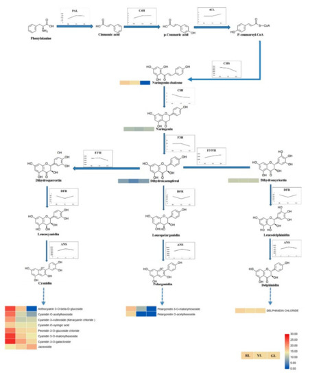 The changing patterns of enzymes activity and intermediate products contents related to anthocyanin synthesis in the process of Cymbidium sinense ‘Red Sun’ leaf color change. Red and blue shading in the lower right corner indicates the relatively high-or low content, respectively. PAL, Phenylalanine ammonia lyase, C4H, cinnamate 4-hydroxylase, 4CL, 4-coumarate CoA ligase, CHS, chalcone synthase, CHI, chalcone isomerase, F3H, flavone 3-hydroxylase, F3′H, flavonoid 3′-hydroxylase, F3′5′H, flavonoid 3′,5′-hydroxylase, DFR, dihydroflavonol reductase, ANS, anthocyanidin synthase. Units on y-scale of enzymes activity is U/g.