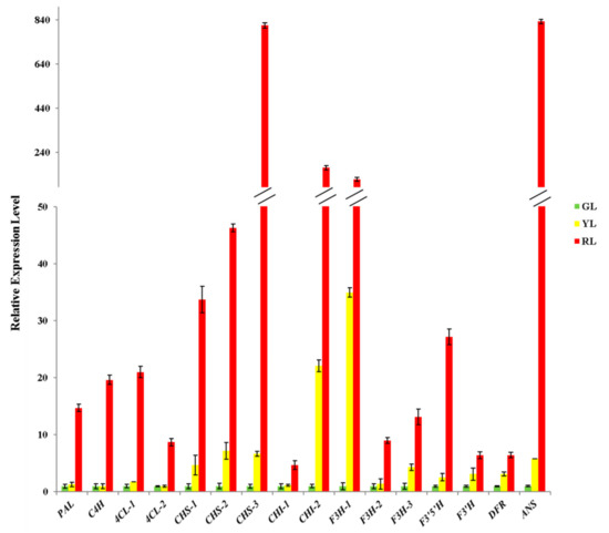 Compared with flower color, the influencing factors of leaf color are more complex. Generally, the greening of leaves is mainly due to the absolute proportion of chlorophyll, and the formation of yellow leaves is mostly due to the degradation of chlorophyll, leaving the color of carotenoids to dominate in leaves [1,2]. Anthocyanins are responsible for the red color of leaves, which is helpful for plants against various biotic and abiotic stresses [3,4]. In Cymbidium orchids, the activation of anthocyanin synthesis can be restored by introducing MYB and bHLH anthocyanin regulators simultaneously [5]. The synthesis pathway of anthocyanins begins with the precursor phenylalanine, resulting in the formation of dihydrokaempferol (DHK) by the catalysis of six enzymes. After the catalysis of four enzymes, DHK produces three kinds of steady-state anthocyanins, including pelargonidin, cyanidin and delphinidin, respectively [6,7,8]. At present, more than 600 anthocyanins found in nature are derived from these three substances and the accumulation of anthocyanins in plants has two main functions: one is to produce rich and colorful visual signals to promote pollination or seed transmission, and the other is to resist a series of biotic or abiotic stresses [9,10].