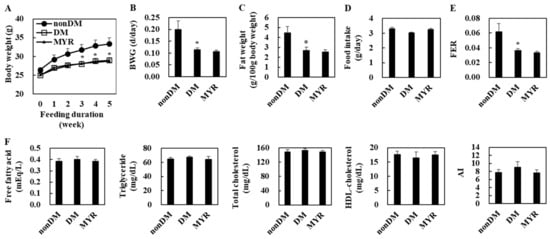 The body weight of the diabetic control (DM) group was significantly lower than that of the non-diabetic (non-DM) group at 3, 4, and 5 weeks of experimental diet feeding (Figure 1A). The DM group also had significantly lower body weight gain, fat weight, and food efficiency ratio (FER) than the non-DM group, although food intake did not differ between the two groups (Figure 1B–E). However, there were no significant differences in plasma lipids levels between the DM and non-DM groups (Figure 1F). In diabetic mice, MYR did not affect body weight, fat weight, food intake, and plasma lipids levels (Figure 1A–F).