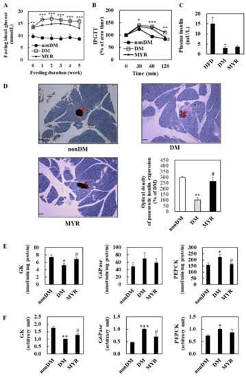 Effects of MYR on fasting blood glucose level (A), IPGTT (B), plasma insulin level (C), pancreas immunohistochemistry (D), and the hepatic glucose-regulating enzymes activities (E) and mRNA expression (F) in HFD/STZ-induced diabetic mice. (A–F): Values are means ± SE (n = 10). Student’s t-test was used to assess the differences among groups.: * p < 0.05, ** p < 0.01, *** p < 0.001; non-DM group versus DM group, # p < 0.05; DM group versus MYR group. (D): Representative images of immunohistochemical staining for insulin in pancreatic sections (arrows). Scale bars represent 19 µm. Magnification is 100×. IPGTT: intraperitoneal glucose tolerance test, GK: glucokinase, G6Pase: glucose-6-phosphatase, PEPCK: phosphoenolpyruvate carboxykinase.
