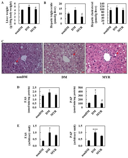 Effects of MYR on liver weight (A), hepatic lipids contents (B), liver morphology (C), and hepatic lipogenic enzymes activities (D) and mRNA expression (E) in HFD/STZ-induced diabetic mice. (A,B,D,E) Values are means ± SE (n = 10). Student’s t-test was used to assess the differences among groups.: * p < 0.05, *** p < 0.001; non-DM group versus DM group, # p < 0.05; DM group versus MYR group. (C) Representative images of hematoxylin and eosin stained liver sections. Arrows indicates lipid droplets. Scale bars represent 19 µm. Magnification is 400×. FAS: fatty acid synthase, PAP: phosphatidate phosphohydrolase.