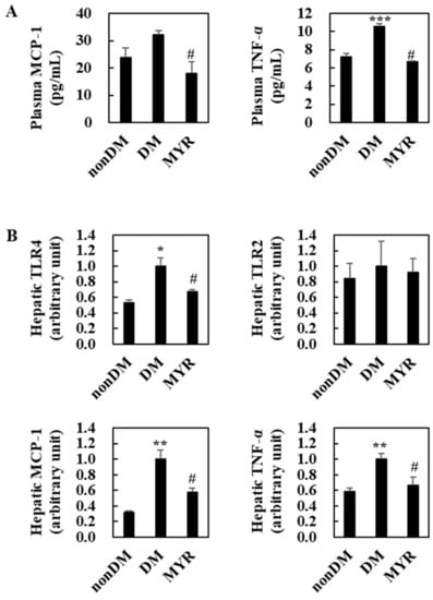 Effects of MYR on plasma pro-inflammatory MCP-1 and TNF-α levels (A) and hepatic pro-inflammatory genes mRNA expression (B) in HFD/STZ-induced diabetic mice. Values are means ± SE (n = 10). Student’s t-test was used to assess the differences among groups. * p < 0.05, ** p < 0.001, *** p < 0.001; non-DM group versus DM group, # p < 0.05; DM group versus MYR group. MCP-1: monocyte chemoattractant protein-1, TNF-α: tumor necrosis factor-α, TLR: toll-like receptor.