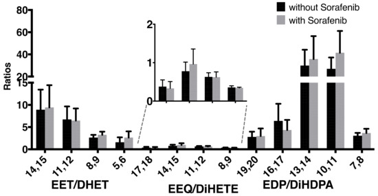 As a marker of sEH activity, we then analyzed the ratio of epoxyeicosanoids to their corresponding diols, and particularly of 14,15-EET to 14,15-DHET (Figure 2). As we did not find higher 14,15-EET/DHET ratios, the observed increase in the EETs might not be predominantly due to the sEH-inhibitory effect of sorafenib. The finding that both EETs and DHETs rise under sorafenib treatment shown in Table 2 could point towards an effect on epoxyeicosanoid production, and not on epoxyeicosanoid hydrolysis.