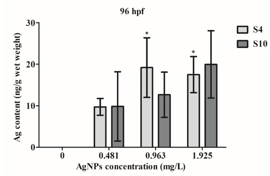 - Lee, K.J.; Browning, L.M.; Nallathamby, P.D.; Osgood, C.J.; Xu, X.-H.N. Silver nanoparticles induce developmental stage-specific embryonic phenotypes in zebrafish. Nanoscale 2013, 5, 11625–11636. [Google Scholar] [CrossRef]