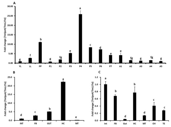 2.2. Developmental and Tissue-Specific Expression Patterns of TmSpz4