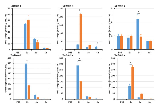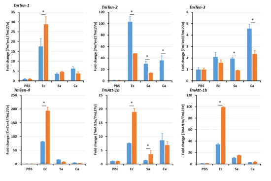 4.5. TmSpz4 Expression and Temporal Induction Pattern Analysis
