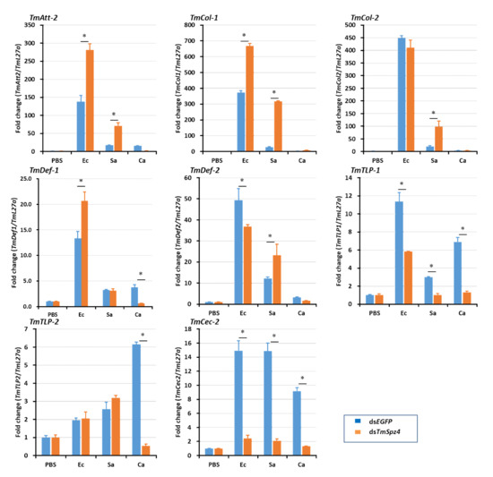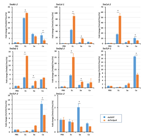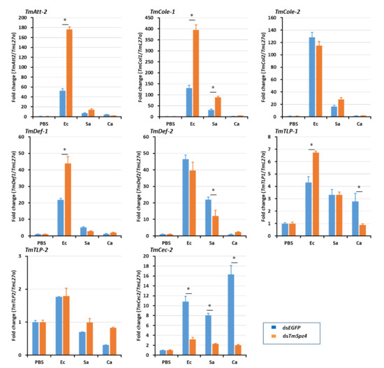 4.7. Effect of TmSpz4 RNAi on AMP Expression against Microbial Challenge