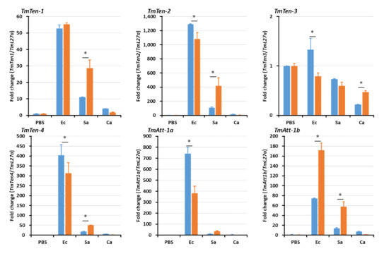 - Jo, Y.H.; Park, S.; Park, K.B.; Noh, M.Y.; Cho, J.H.; Ko, H.J.; Kim, C.E.; Patnaik, B.B.; Kim, J.; Won, R. In silico identification, characterization and expression analysis of attacin gene family in response to bacterial and fungal pathogens in Tenebrio molitor. Entomol. Res. 2018, 48, 45–54. [Google Scholar] [CrossRef]