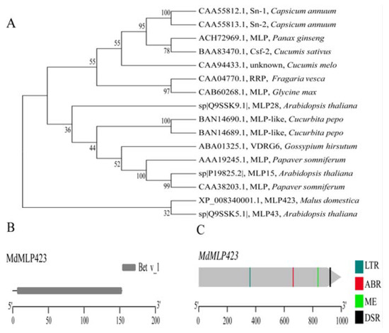 Phylogenetic analysis, protein structure and cis-acting elements of MdMLP423. (A) Phylogenetic analysis of the MdMLP423 protein with its orthologous genes in other plant species. (B) Conserved domain analysis of the MdMLP423 protein. (C) Various cis-acting elements of the MdMLP423 promoter.