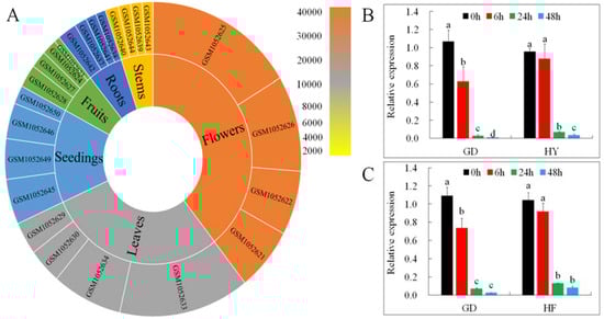 Expression patterns of MdMLP423. (A) Expression patterns of MdMLP423 in root, stem, leaf, flowers, fruit, and seedings of Malus × domestica. (B) qRT-PCR of MdMLP423 ‘GD’ and ‘HY’ cultivars at 0, 6, 24, and 48 h post-inoculation with Botryosphaeria berengeriana f. sp. piricola (BB). (C) qRT-PCR of MdMLP423 at 0, 6, 24, and 48 h post-inoculation with Alternaria alternata apple pathotype (AAAP). The different lowercase letters indicate significant difference at p < 0.05.