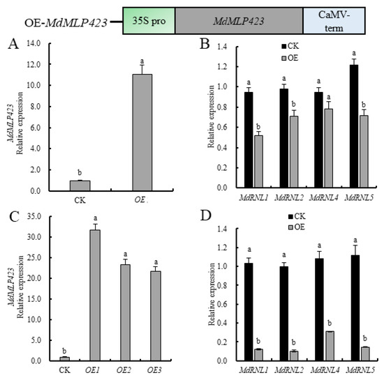 Since the expression of MdMLP423 was inhibited under different biotic stresses, we explored whether MdMLP423 contributed to plant stress resistance. Therefore, we transiently overexpressed MdMLP423 in ‘GD’ leaves and assessed the expression of four known disease-resistant genes (MdRNL1, MdRNL2, MdRNL4, and MdRNL5) [32]. There was a transient but statistically significant 11.0-fold increase in MdMLP423 expression in leaves compared with the CK (Figure 3A), and all four MdRNL genes were down-regulated (1.2–1.8-fold lower; Figure 3B).