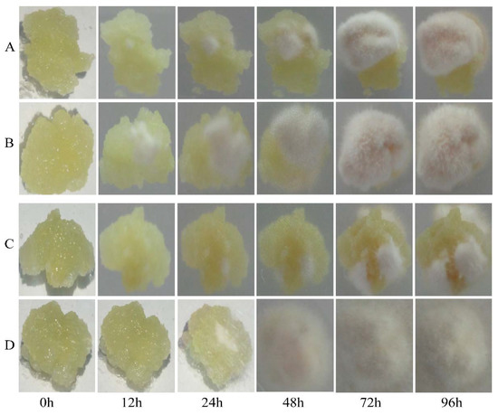 Infection level of calli inoculated with BB and AAAP. Photographs of MdMLP423-overexpressing calli (A,C) and CK calli (B,D) at 0, 12, 24, 48, 72, and 96 h post-inoculation with BB (A,B) or AAAP (C,D).