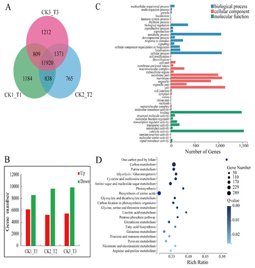 Analysis of differentially expressed genes (DEGs) of transgenic calli and CK. (A) Venn diagram of DEGs in comparative groups CK_1/T_1, CK_2/T_2, and CK_3/T_3. (B) The statistics of DEGs of comparative groups CK_1/T_1, CK_2/T_2, and CK_3/T_3. (C) GO categories analysis of DEGs. (D) Top 20 KEGG pathways enrichment analysis of DEGs (according to the Q value).