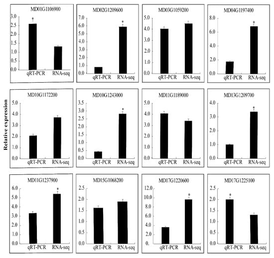 qRT-PCR validation of differential gene expression. The “*” indicate significant difference at p < 0.05.