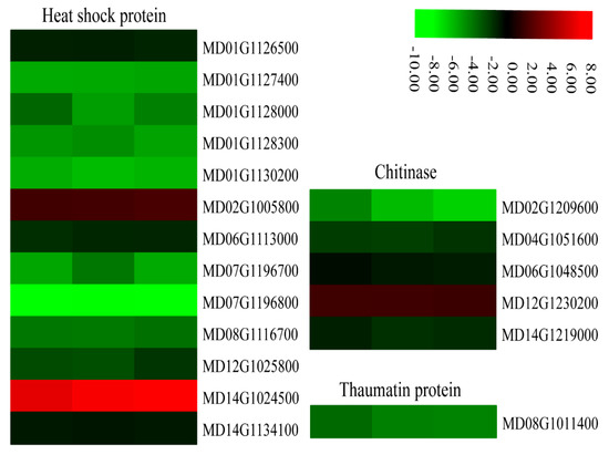 Heat shock proteins (HSPs) are a subfamily of molecular chaperones that are rapidly induced under stress responses. All 13 HSP genes identified in our data belonged to the HSP70 group and 11 of these genes were down-regulated in MdMLP423-overexpressing calli compared with the CK calli (Figure 10).