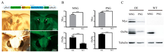 To confirm whether exogenous BmOsi9a with a Myc-tag was synthesized in the transgenic line, proteins were extracted from the MSG and PSG of day-3 fifth-instar larvae (Figure 1C) for Western blotting. The expression of exogenous BmOsi9a was consistent with the results obtained at the mRNA level. In the wild-type line, BmOsi9a was detectable only in the MSG and not in the PSG (Figure 1C). Clear bands for Myc and BmOsi9a in the MSG of the transgenic line were found; their corresponding signal bands could be detected in the PSG of the transgenic line.