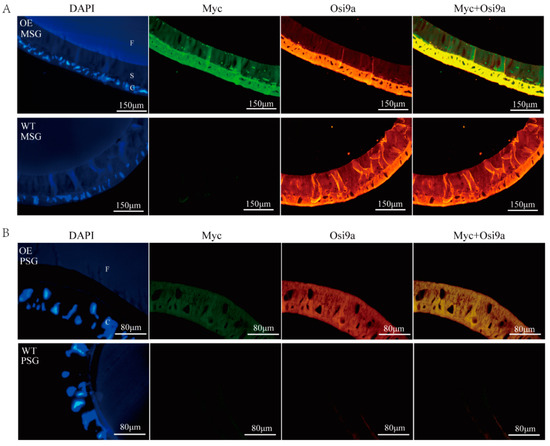 Location of transgenic overexpressed BmOsiris9a in the silk gland. (A). Immunofluorescence of BmOsi9a and Myc in the MSG. (B). Immunofluorescence of BmOsi9a and Myc in the PSG. Sections were prepared from the MSG and the PSG of the OE and the WT and were observed under ultraviolet light for DAPI, blue light for FITC, and green light for CY3. C: Cells; S: Sericin layer; F: Fibroin layer.