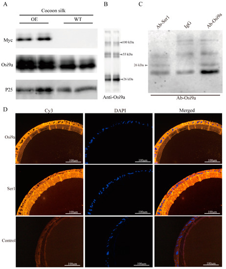 Interaction between BmOsirsi9a and Ser1. (A). Western blotting of BmOsi9a and Myc-tag in the cocoon silks of the OE and WT, using P25 as a control. Proteins dissolved from the cocoon were separated by SDS-PAGE and immunoblotted with anti-BmOsi9a, anti-Myc, and anti-P25 antibodies. (B). Western blotting of BmOsi9a in the cocoon silks. Two high-molecular-weight bands (55 and 100 kDa) contained the Ser1 protein, as determined by LC-MS/MS analysis. The two lanes are twice biological replicates. (C). Co-IP analysis of BmOsi9a and Ser1. Lane 1: proteins of the MSG incubated with anti-Ser1 antibody; Lane 2: proteins of the MSG incubated with rabbit IgG; Lane 3: proteins of the MSG incubated with anti-BmOsi9a antibody. (D). Immunofluorescence of BmOsi9a and Ser1 in the MSG. Sections were prepared from the MSG and observed under ultraviolet light for DAPI and green light for CY3.
