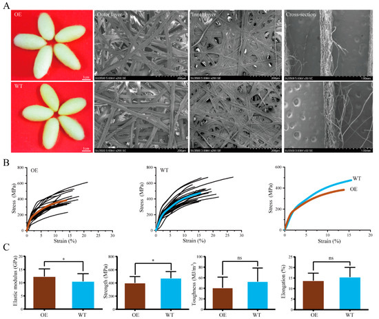 Comparison of phenotypes and mechanical properties of silks from the OE and WT. (A). The phenotype of cocoons and silk fibers of the OE and WT. (B). Stress–strain curves of the silk fibers. (C). Toughness, maximum strength, toughness, and elastic modulus. Error bars, SD; * p < 0.05.