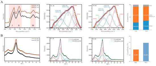 Secondary structural characteristics and crystallinity of silk fibers. (A). ATR-FTIR spectra from 1100 to 1800 cm−1 of silk from the silks of the OE and WT. Deconvolution of the corresponding amide I band. Comparison of the β-sheet content in the silks between the OE and WT. (B). X-ray diffraction diffractograms of silk from the silks of the OE and WT. Deconvolution of the silk diffractograms, with intensity as a function of the scattering angle 2θ. Comparison of the crystallinity of the silks between the OE and WT.