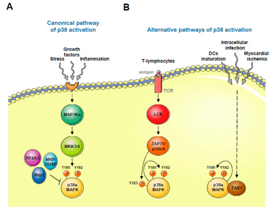 p38 MAPK activation. (A) Canonical pathway: Several environmental stimuli activate p38 by phosphorylation of Thr180 and Tyr182 through MAP3Ks and MAP2Ks MKK3/6. Phosphatases PP2A/C, Wip1 and MKP/DUSP inhibit p38 activation. (B) Alternative pathways: Noncanonical p38 activation occurs in T-lymphocytes upon antigen presentation (TCR: antigen T cell receptor) and involves phosphorylation of Tyr323, which promotes an auto-phosphorylation loop. In addition, p38 can be activated by the presence of other stimuli such as intracellular infection, myocardial ischemia or dendritic cells (DCs) maturation signals. In these cases, TAB1 associates with p38, promoting its auto-phosphorylation. This figure was created using Servier Medical Art templates, which are licensed under a Creative Commons Attribution 3.0 Unported License; https://smart.servier.com.