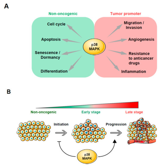 The dual role of p38 MAPK in tumorigenesis. (A) p38-dependent cellular. processes can be classified on the basis of the role they play during tumorigenesis. (B) p38 inhibits oncogenic transformation and promotes the progression of tumors in late stages of the disease. This figure was created using Servier Medical Art templates, which are licensed under a Creative Commons Attribution 3.0 Unported License; https://smart.servier.com.