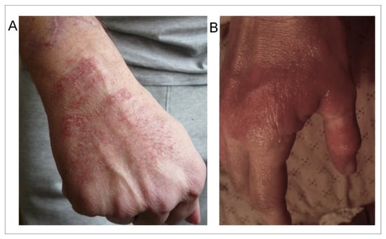Examples of skin lesions observed on the hand of an EHS-bearing patient (A) and of an EHS/MCS-bearing patient (B). (Photographs are issued from the database).
