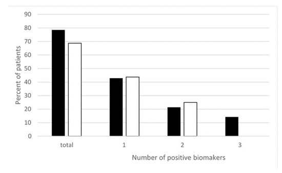Moreover, more recently, we measured different oxidative and nitrosative stress-related biomarkers such as thiobarbituric acid reactive substances (TBARS), oxidized glutathione (GSSG), and NTT in the peripheral blood of EHS patients. As reported in Figure 2, we found that nearly 80% of EHS patients presented with an increase in oxidative/nitrosative stress-related biomarkers—more precisely, with only one of these three studied biomarkers in 43% of the patients, two of these biomarkers in 21% of them, and all three in 15% []. This clearly indicates that, in addition to low-grade inflammation and an anti-white matter autoimmune response, EHS can also be diagnosed by the presence of oxidative/nitrosative stress.