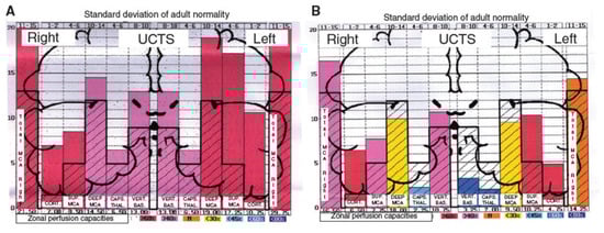 Moreover, by using ultrasonic cerebral tomosphygmography (UCTS) applied to the temporal lobes [], we showed there is a significant decrease in mean pulsometric index in the middle cerebral artery-dependent tissue areas of these lobes, especially in the capsulo-thalamic area, which corresponds to the limbic system and the thalamus []. As exemplified in Figure 3, this tissue hypo-pulsation—mainly detected in the capsulo-thalamic area of these lobes—suggests that EHS and/or MCS are associated with a capillary BBF decrease in these two brain structures, thus leading to the hypothesis that they may be associated with some vascular and/or neuronal dysfunction [,,]. Although these abnormalities are not specific, since they may be similar to those found in Alzheimer’s disease and other neurodegenerative disorders, we recently confirmed that UCTS could presently be one of the most accurate imaging techniques to be used to diagnose EHS and/or MCS and to follow objectively treated patients [].