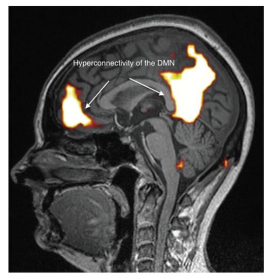It appears, however, that these brain abnormalities are not restricted to the limbic system and the thalamus, since, by using TDU as indicated above, we showed that, in EHS and/or MCS patients, BBF in the middle cerebral arteries may be abnormal. Moreover, by using functional MRI (fMRI) in EHS patients exposed chronically to extremely low-frequency (ELF) radiation, regional BBF changes were also reported by Heuser and Heuser, but mainly in the frontal lobes, as an abnormal default mode network (DMN) (particularly as hyper-connectivity of this DMN), in association with a decrease in cerebral BBF and metabolic processes in the two so far individualized fragment hyper-connected components []. For example, in Figure 4, abnormal DMN is represented with fragmented hyper-connectivity of the anterior component and posterior component, which may lead to decreased BBF and/or metabolism in the bi-frontal lobes.