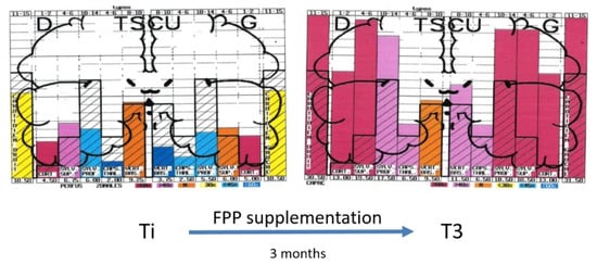 There is, at the moment, no recognized standardized treatment of EHS. There are, however, some treatments that could be indicated, on the basis of biological investigations. We showed, for example, that patients with EHS present frequently with a profound deficit in vitamins and trace elements, especially in vitamin D and zinc, which should be corrected [,,]. Anti-histaminics should also be used in the case of increased histamine in the blood. Furthermore, antioxidants such as glutathione and, more specifically, anti-nitrosative medications should also be used in case of oxidative/nitrosative stress. Moreover, as exemplified in Figure 5, we showed that natural products such as fermented papaya preparation (FPP) and ginkgo biloba can restore brain pulsatility in the various middle cerebral artery-dependent tissue areas of temporal lobes, thereby improving brain hemodynamics and, consequently, brain oxygenation []. Since FPP was shown to possess some antioxidant, anti-inflammation, and immune-modulating properties [,,], we recommend the use of this widely available natural product.