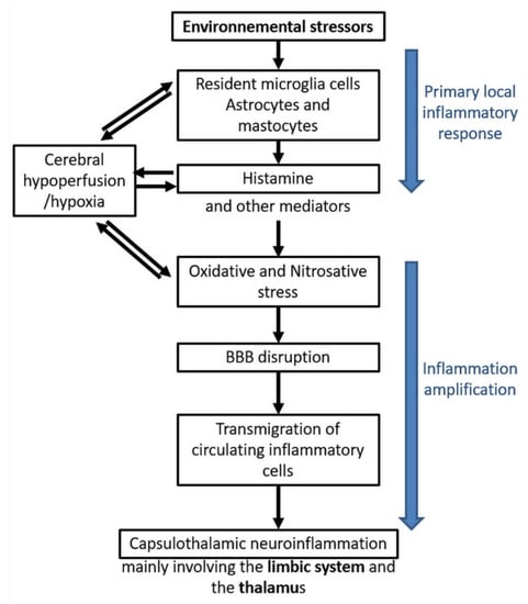 In a first step, there could be an initial local inflammatory response to environmental stressors, whatever they may be. Resident microglia cells, astrocytes, and mastocytes could be the first cells in the brain locally involved in the inflammatory process, releasing inflammatory mediators such as histamine. On the basis of our data [,,,,], it is speculated that histamine is a key mediator contributing to the induction of oxidative/nitrosative stress and, consequently, to cerebral hypoperfusion, thereby leading to some local cerebral hypoxia.