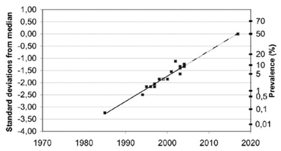 Furthermore, although these reported EHS prevalence figures are only estimations, not critically evaluated due to a lack of objective criteria to clearly define EHS, it is possible—as speculated in Figure 7—that the EHS prevalence will continue to grow in the future, in as much as the manufacture of wireless technology and industrial chemicals will continue to develop.