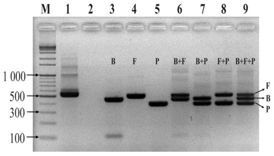 Agarose gel electrophoresis of multiplex PCR products. Letters B, F, and P signify the DNA template extracted from B. fragilis GUT-04, C. butyricum TO-A, and S. sonnei KCCM 41282, respectively. B+F, B+P, F+P, and B+F+P represent mock communities. M: marker 1kb DNA ladder; Lane 1: positive control; Lane 2: negative control; Lane 3: Bat1+Eub797; Lane 4: Fir7+Eub797; Lane 5: Pro3+Eub797; Lane 6: Bat1+Fir7+Eub797; Lane 7: Bat1+Pro3+Eub797; Lane 8: Fir7+ Pro3+Eub797; and Lane 9: Bat1+Fir7+Pro3+Eub797. A eubacterial primer set, Eub268/Eub797, with template DNA from the mock community without probes served as the positive control, and a primer set, 27F/1492R, without template DNA, served as the negative control.