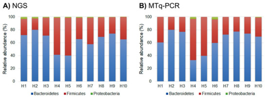 Relative proportions of the three phyla from fecal samples of healthy subjects determined by (A) NGS and (B) MTq-PCR.