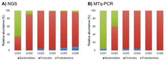 Relative proportions of the three phyla from fecal samples of UC patients determined by (A) NGS and (B) MTq-PCR.