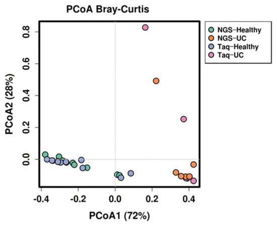 Principal coordinate analysis (PCoA) was performed to compare the profiling efficiency of NGS and MTq-PCR (Figure 5). The relative proportions of the three dominant phyla in UC patients and healthy volunteers were used for the analysis. The clustering of UC patients and healthy volunteers using NGS was similar to the clustering seen when using MTq-PCR, which indicated the potential of MTq-PCR for monitoring microbiota profile alterations.