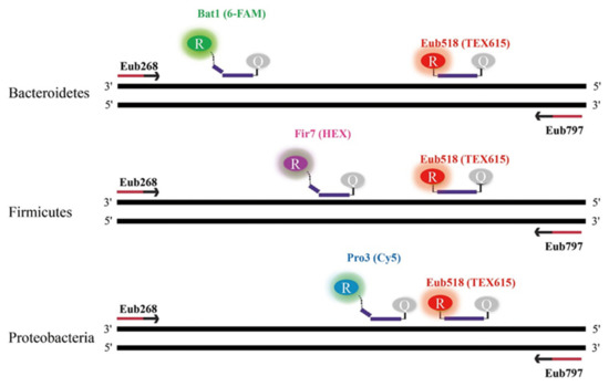Schematic view of the multiplex TaqMan qPCR for simultaneous detection of the three dominant phyla in gut microflora (Bacteroidetes, Firmicutes, and Proteobacteria) in one PCR reaction.