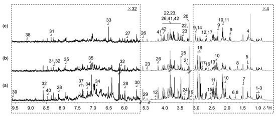 All NMR spectra were acquired on a Bruker Avance 800 MHz NMR spectrometer (800.15 MHz for proton frequency) at 302 K using a 5 mm cryoprobe (Bruker Biospin, Rheinstetten, Germany) [55]. A one-dimensional (1D) 1H NMR spectrum was acquired for each sample in a random order using the first increment of the gradient selected NOESY pulse sequence (recycle delay−G1−90°−t1−90°−tm−G2−90°−acquisition) with water presaturation during both the recycle delay (2 s) and mixing time (tm, 80 ms) [56]. For each spectrum, a total of 64 transients were collected into 32,768 data points over a spectral width of 16,025 Hz with a 90° pulse length adjusted to around 11 μs. For selected samples, a variety of two-dimensional (2D) NMR spectra [54] were acquired for the purpose of resonance assignment, including 1H−1H Correlation Spectroscopy (COSY), 1H−1H Total Correlation Spectroscopy (TOCSY), 1H J-Resolved Spectroscopy (JRES), 1H−13C Heteronuclear Single Quantum Correlation Spectroscopy (HSQC), and 1H−13C Heteronuclear Multiple Bond Correlation Spectroscopy (HMBC).