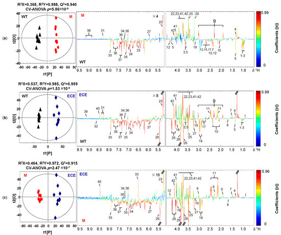 Cross-validated OPLS-DA scores plots (left) and the corresponding loadings plots (right) derived from the comparison of 1H NMR spectra for (a) the wild type (WT, ▲) and the oscyp96b4 semi-dwarf mutant (M, ●), (b) the wild type (WT, ▲) and the OsCYP96B4 ectopic expression (ECE, ◆), (c) the oscyp96b4 semi-dwarf mutant (M, ●) and the OsCYP96B4 ectopic expression (ECE, ◆). Metabolite keys are shown in Figure 1 and Table S1.