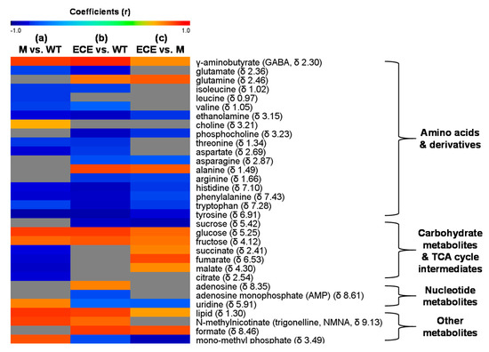The OPLS-DA models were interpreted as back-transformed and color-coded correlation coefficients loadings plots [62] (MATLAB 7.0, The Mathworks Inc., Natick, MA, USA), where the colors indicate the significance of differentiating metabolites, with a warm color (e.g., red) being more significant than a cool color (e.g., blue). The cutoffs for correlation coefficients were chosen on the basis of discrimination significance (p < 0.05), e.g., a cutoff value (|r|) of 0.602 was corresponding to the sample number (n) of 10. Differentiating metabolites were also summarized in a heat map, color-coded with the Pearson correlation coefficients from the OPLS-DA models (MeV version 4.9.0).