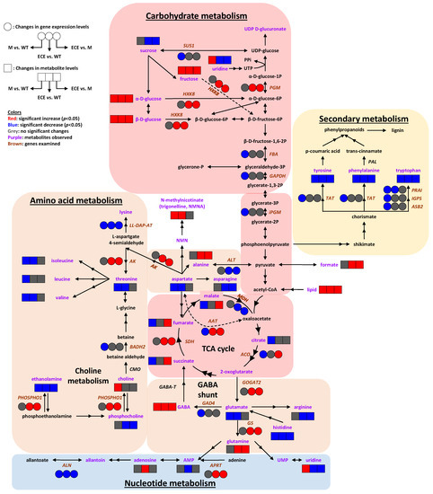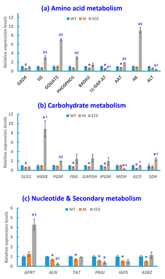There were significant changes in the gene expression involved in carbohydrate metabolism, including significant down-regulation of genes encoding sucrose synthase 1 (SUS1), fructose-bisphosphate aldolase (FBA), glyceraldehyde 3-phosphate dehydrogenase (GAPDH), 2,3-bisphosphoglycerate-independent phosphoglycerate mutase (iPGM) and aconitase (ACO) in M, along with the up-regulation of genes encoding hexokinase-8 (HXK8), phosphoglucomutase (PGM), and succinate dehydrogenase (SDH) and down-regulation of genes encoding malate dehydrogenase (MDH) in ECE (Figure 4b).