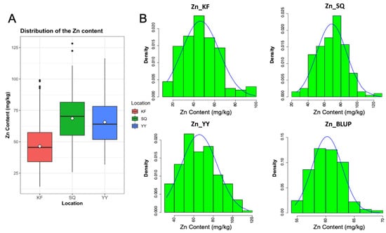 Distribution of the grains zinc concentrations measured in the wheat association mapping population. (A) Boxplot of zinc grain concentration in Kaifeng (KF), Shangqiu (SQ), and Yuanyang (YY) location. (B) Distribution of the zinc grain concentration in the individual environments (including the combination of three locations, BLUP) among the 207 hexaploid wheat accessions.